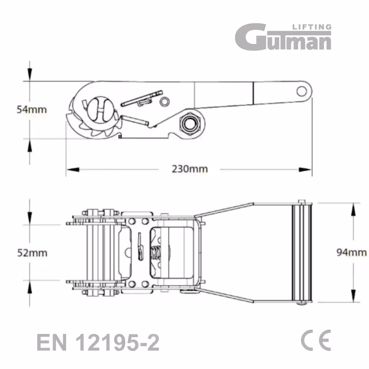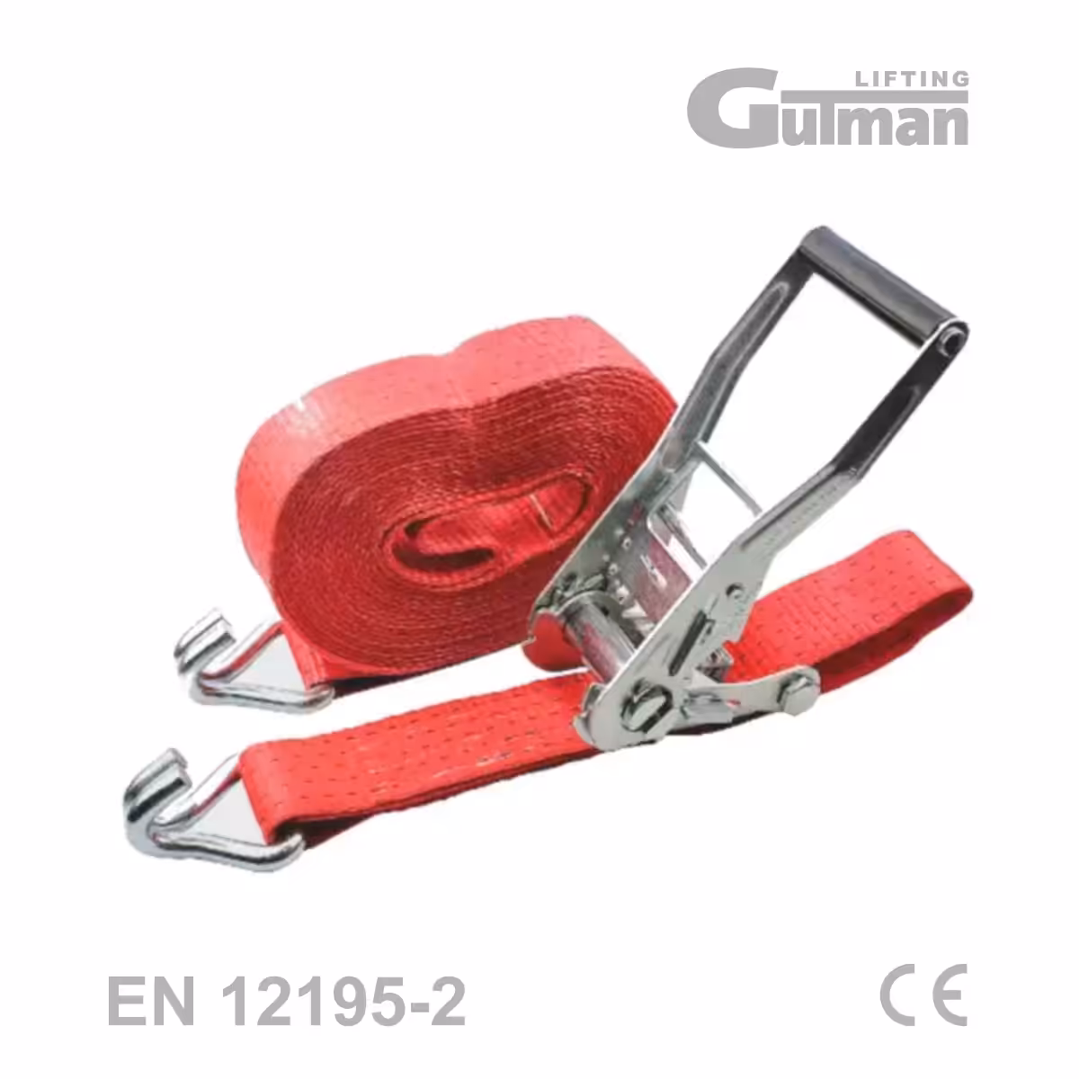 Kamionska gurtna – španer za teret širine trake 50 mm, s kapacitetom vezivanja 5T i STF vrijednosti 300 daN, izrađena od materijala vlačne čvrstoće 650–800 N/mm², s prekidnom čvrstoćom trake 7500 daN, maksimalnim istezanjem 7 %, upijanjem vlage 0,4 %, talištem 260 °C te radnom temperaturom od -40 °C do +100 °C, u skladu s normom EN 12195-2; druge dužine izrađujemo po narudžbi.