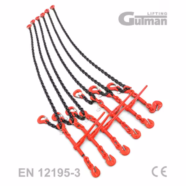 Prije svake primjene pregledajte lančani zatezač 13mm: karike lanca ne smiju biti napukle, deformirane, istrošene ili s vidljivim pukotinama, kuke moraju imati funkcionalan osiguračem, a mehanizam račne mora se slobodno okretati bez zaglavljanja. Pričvrstite jednu kuku-skraćivač za privezišni prsten na vozilu ili platformi, a drugu za odgovarajuće privezišno mjesto na teretu. Polugom račne za lanac 13mm zatežite postepeno, provjeravajući da je teret stabilan i da je opterećenje ravnomjerno raspoređeno na sve točke privezivanja. Za terete iznad 10000 daN obavezno koristite više španerа za lanac — nikada ne prekoračujte dopuštenu nosivost jednog zatezača.