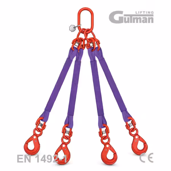 Četverokraka poliesterska priveznica sa samozatvarajućom kukom kombinira maksimalnu stabilnost četiri kraka s vrhunskom brzinom automatskog zatvaranja. Dizajnirana je za skladišta, proizvodne linije i industrijsku primjenu gdje se najveći i najnepravilniji tereti (2,1-16,8t) podižu više od 20 puta dnevno. Sve četiri kuke automatski se zatvaraju čim se teret podigne – operater ne mora ručno zatvarati četiri osigurača što drastično ubrzava cikluse i maksimalno smanjuje fizički umor. Četiri kraka stvaraju savršen kvadrat koji osigurava ravnotežu čak i kod najasimetričnijih tereta, što je ključno za vrlo široke ili nepravilne komponente.