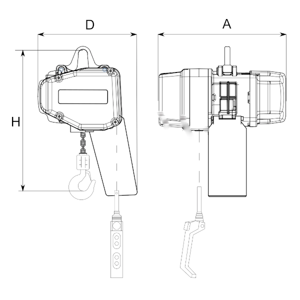 Aluminijsko kućište otporno na koroziju zajedno s IP55 klasom zaštite omogućuje pouzdano funkcioniranje u različitim industrijskim okruženjima, od proizvodnih hala do servisnih centara. Jednonitni visokootporni lanac G80 promjera 5,6 mm projektiran je za dugotrajnu upotrebu uz minimalno održavanje. Kompaktne dimenzije s headroom-om od samo 410 mm omogućuju instalaciju čak i u prostorima s ograničenom visinom.