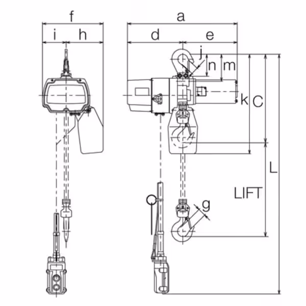 Poniklani G80 lanac (Φ 4 mm), aluminijsko kućište, granični prekidači, standardna visina dizanja 3 m (opcija do 100 m). Otporne na vremenske uvjete i koroziju. Opcije: daljinsko upravljanje i montaža na različite vrste ovjesnih kolica. KITO – japanski proizvođač s više od 90 godina iskustva u dizalicama.