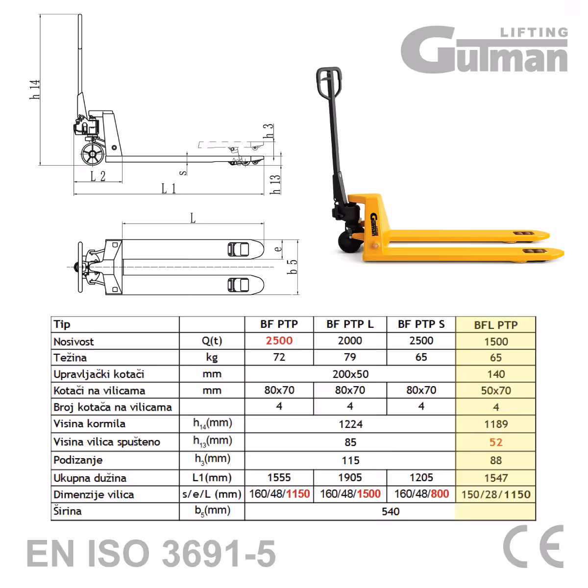 | Specifikacije | Nizkoprofilni paletni viličar 1,5 t 1150 mm višina: 52 mm, za nizke palete |